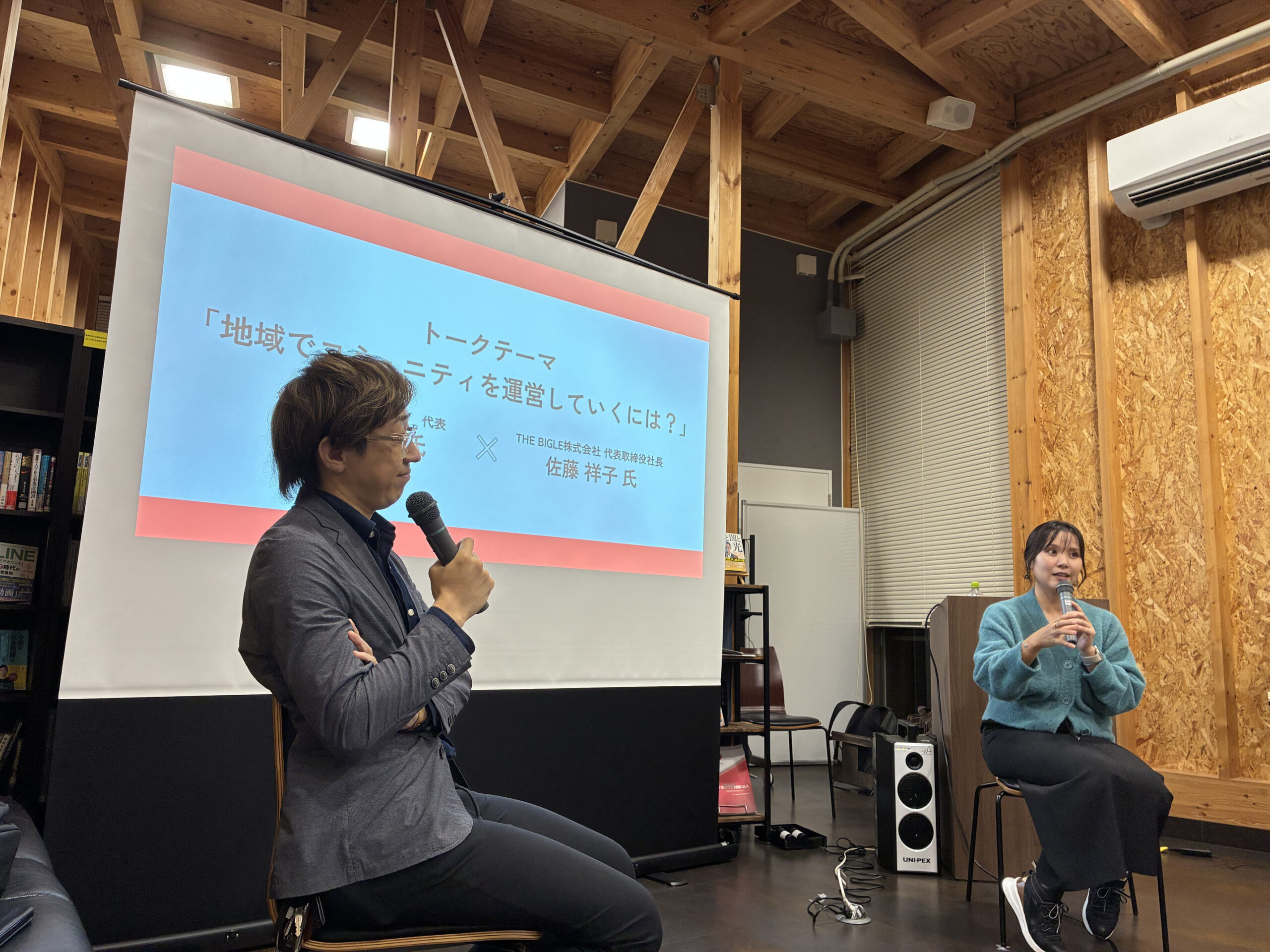 「コミュニティは巻き込みが大事」「コミュニティは部活のようなもの」など、活発な意見交換が行われました。さらにお二人の要望で参加者皆様のご意見も聞きたいということで会場全体で宇部市のコミュニティの未来について意見を交わしました。