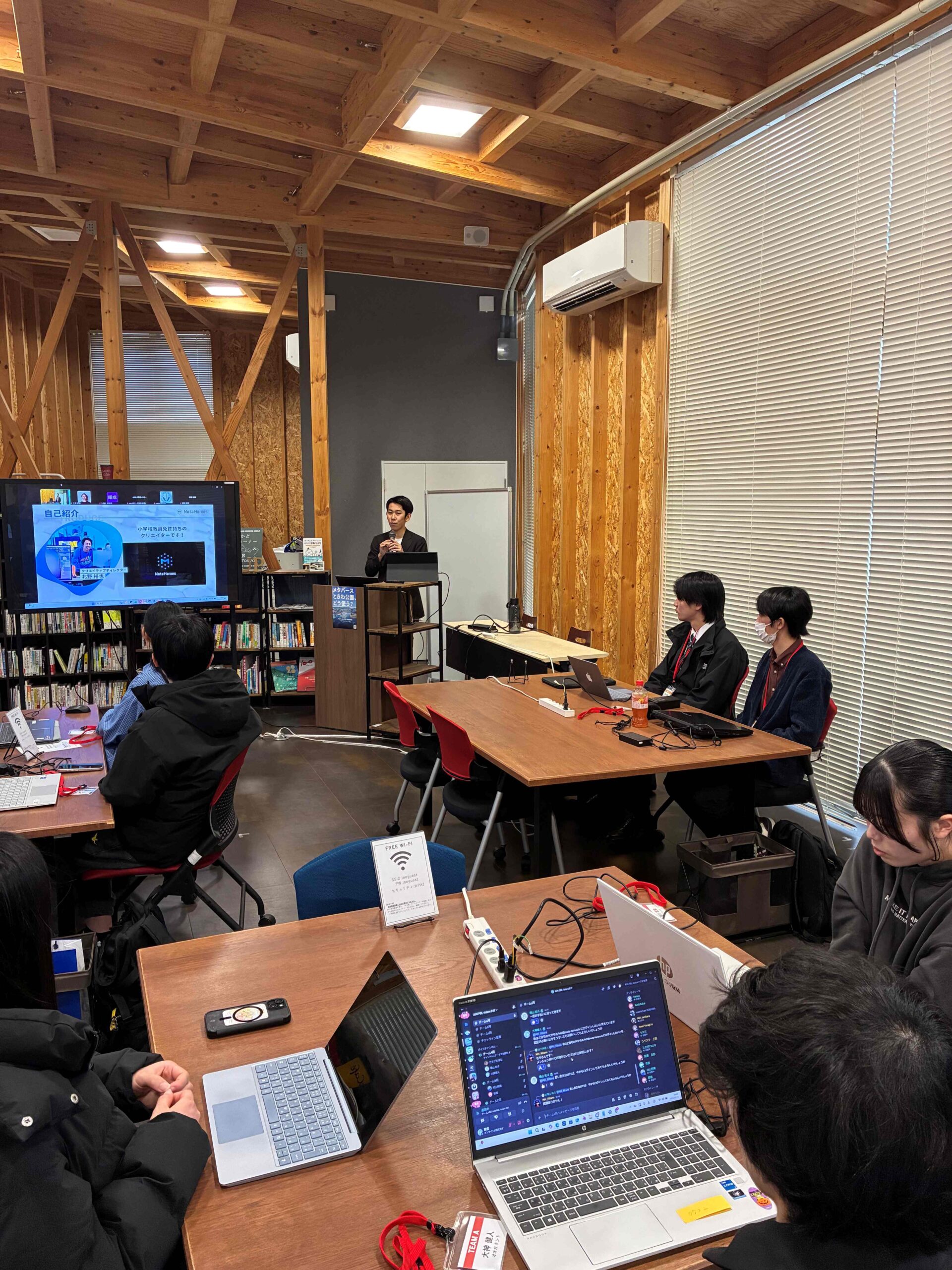初日は、インターンシップの目的や進め方の説明、役割分担の共有、「メタバースときわ公園」の概要紹介を行った後、各チームで自己紹介とグループディスカッションを実施しました。開始直後は緊張した様子も見られましたが、ディスカッションを重ねるうちに徐々に打ち解け、チーム内で活発な意見交換が行われていました。短時間で関係性を築き、主体的にアイデアを出し合う姿が印象的で、参加学生の意欲の高さが感じられました。